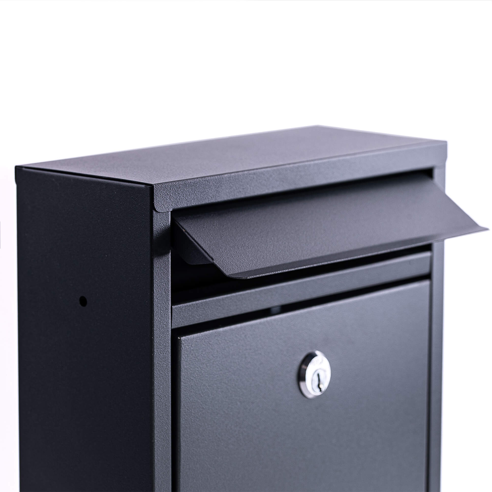 Kompaktowa skrzynka na listy w kolorze antracytowym o klasycznym kształcie. Maksymalny formatu listu, jaki można w niej zamieścić to C5.