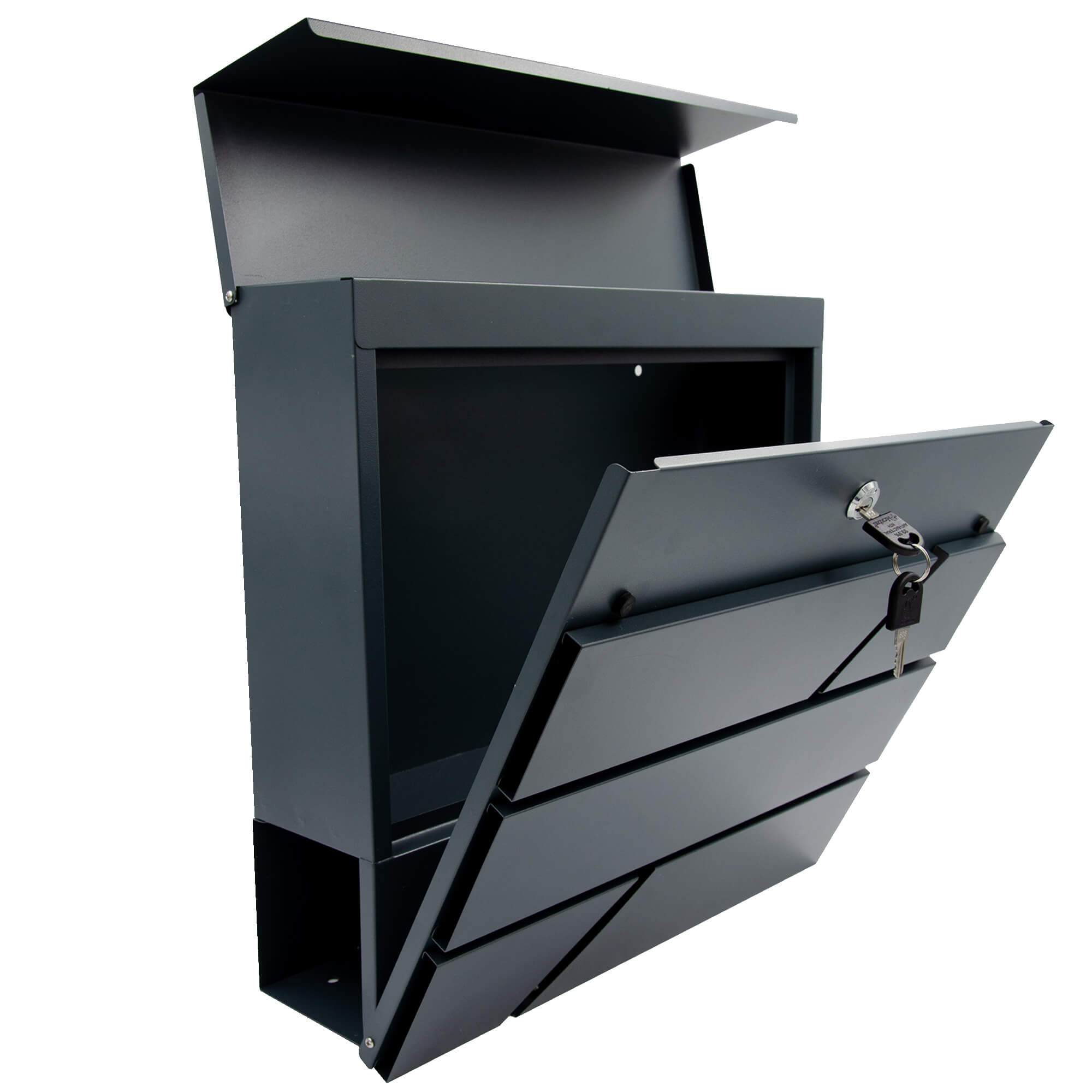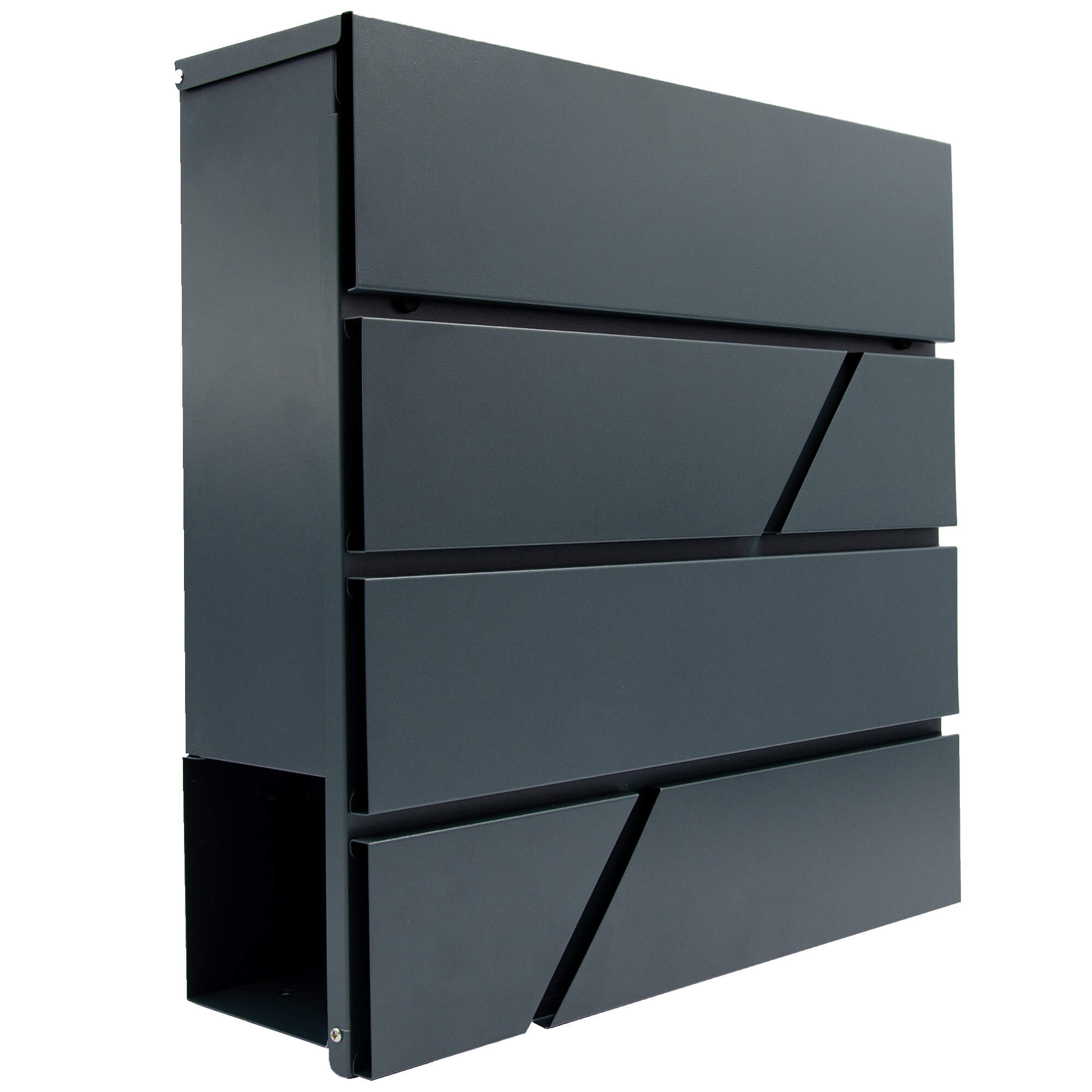 Duża skrzynka na listy w kolorze antracytowym o nowoczesnym kształcie. Maksymalny formatu listu, jaki można w niej zamieścić to C4.