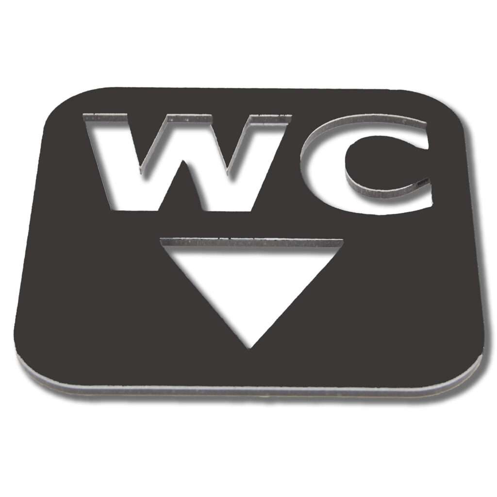 Piktogram wykonany z dibondu o wymiarach 10×10 cm to kwadratowy znak informacyjny, który wizualnie przedstawia oznaczenia dla toalet damskich i męskich.