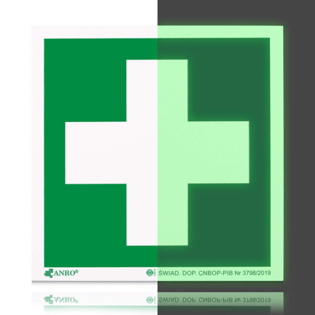 Fotoluminescencyjny znak ewakuacyjny zgodny z najnowszą normą PN-EN ISO 7010:2012 dostępny na płycie sztywnej PCV o grubości 1 mm: